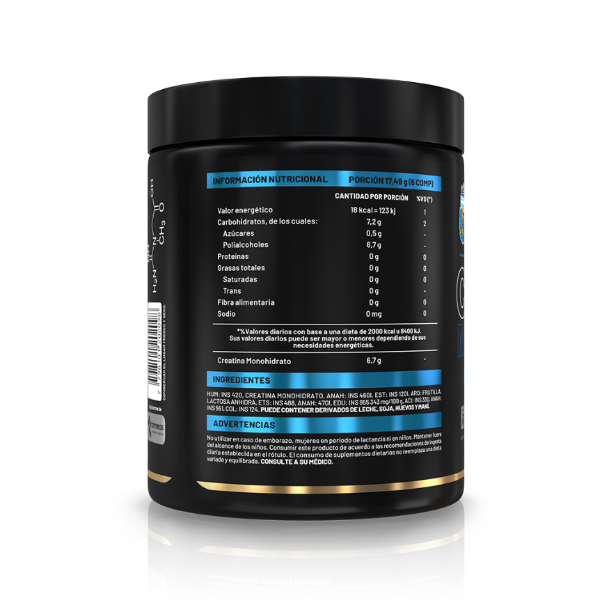 HUM: INS 420, Creatina Monohidrato, ANAH: INS 460i, EST: INS 120i, ARO: Frutilla, Lactosa anhidra, ETS: INS 468, ANAH: 470i, EDU: ins 955 343 mg/100 g, ACI: INS 330, ANAH: INS 551, COL: INS 124. PUEDE CONTENER DERIVADOS DE LECHE, SOJA, HUEVOS Y MANÍ.