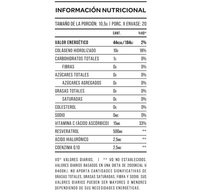 ✔ 10 grs de colágeno, 15 mg de Vitamina C, 2,5 mg de Coezima Q10, 500 mg de Reverastrol y 2,5 mg de ácido hialurónico por porción.